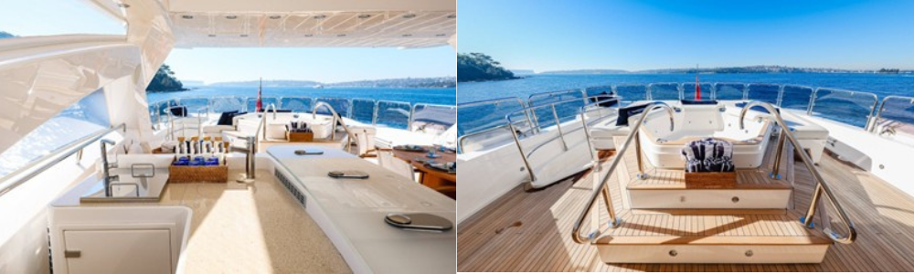 Her interior is finished in classic high-gloss timber with premium stone finishes and soft neutral furnishings, while expansive exterior entertaining areas include a shaded aft deck, foredeck sunpads, and a vast flybridge complete with hardtop, jacuzzi, wet bar and generous lounge zones.